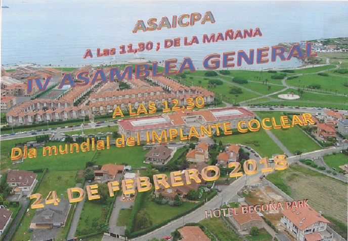 La Asociación Asturiana de Implantados Cocleares y Otros problemas Auditivos (ASAICPA) convoca a todos sus socios/as para la celebración de la próxima Asamblea General Ordinaria que tendrá lugar el próximo SÁBADO, día 27 de Febrero de 2016 en el Hotel Begoña Park, sito en Carretera de la Providencia, Km 566, 33203 Gijón (Coordenadas GPS: 43.544071 , -5.641220') a las 10:30 AM horas en Primera Convocatoria y a las 11:00 AM horas en Segunda Convocatoria, con el siguiente orden del día,